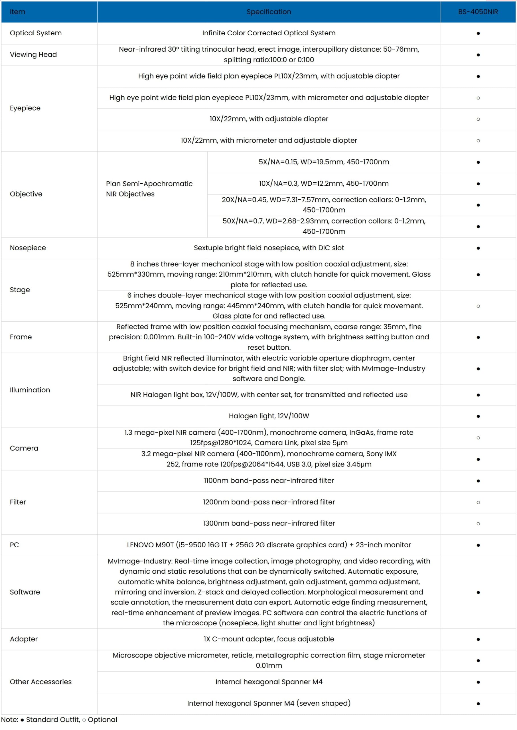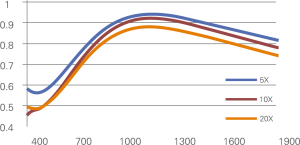 سیستم تصویربرداری میکروسکوپ صنعتی فروسرخ BS-4050NIR به مجموعهای از عدسیهای شیئی فروسرخ حرفهای با بزرگنمایی 5X تا 50X مجهز است که قادر به تصحیح انحرافات اپتیکی (Aberration Correction) از ناحیهی مرئی تا فروسرخ نزدیک میباشند. این عدسیها برای مشاهدهی معمول در زمینه روشن و نیز برای مشاهدهی اختصاصی در ناحیهی فروسرخ مناسباند.