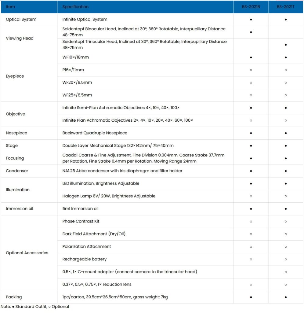 میکروسکوپ BS-2021B/T دستگاهی اقتصادی، کاربردی و کاربرپسند است. این مدل از سیستم نوری بینهایت (Infinite Optical System) و نور LED با طول عمر بالا استفاده میکند که مشاهده را راحتتر میسازد. کاربرد گستردهای در زمینههای آموزشی، دانشگاهی، دامپزشکی، کشاورزی و پژوهشی دارد. با استفاده از آداپتور چشمی (عدسی کاهنده) میتوان دوربین دیجیتال یا چشمی دیجیتال را به لوله سهچشمی یا لوله چشمی متصل کرد. همچنین امکان افزودن باتری داخلی قابل شارژ برای استفاده در فضای باز یا محیطهایی با نوسان برق وجود دارد.